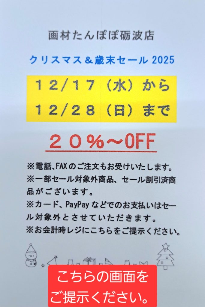クリスマス&歳末セール 2025.12.12 画材たんぽぽ砺波店 12/17(水)~12/28(日) 20%~OFF 電話、FAXのご注文もお受けします。 カード、ペイペイなどのお支払いはセール対象外とさせていただきます。 お会計時にこちらをご提示ください。 一部セール対象外の商品がございます。 ホームページをリニューアルしました 前の記事 営業時間の変更 次の記事